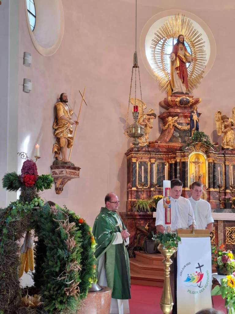 Mit den Klängen der Musikkapelle und der schönen Erntekrone zogen wir zum Kirchplatz, wo sie und verschiedene andere Früchte und Speisen dort Pfr. Ferdinand segnete. Anschließend feierten wir den Festgottesdienst, der von einer Bläsergruppe musikalisch gestaltet wurde.