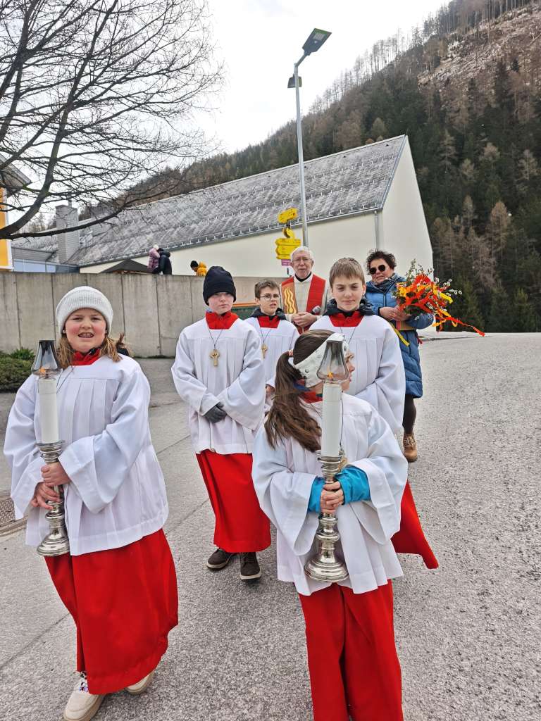 Palmsonntag, 29.3.2026 - Mit dem Palmsonntag haben wir die "Heilige Woche" - auch Karwoche genannt - begonnen. Sie spannt den Bogen vom feierlichen Einzug Jesu in Jerusalem, bis zur Auferstehung Jesu am Ostermorgen. Mit der Segnung der Palmzweige am Gemeindeplatz und anschließendem Einzug in die Pfarrkirche, begannen wir diese Heilige Zeit. Anschließend feierten wir einen feierlichen, den die Erstkommunionkinder mitgestalteten. Mit Symbolen brachten sie uns das Leiden und Sterben Jesu näher.